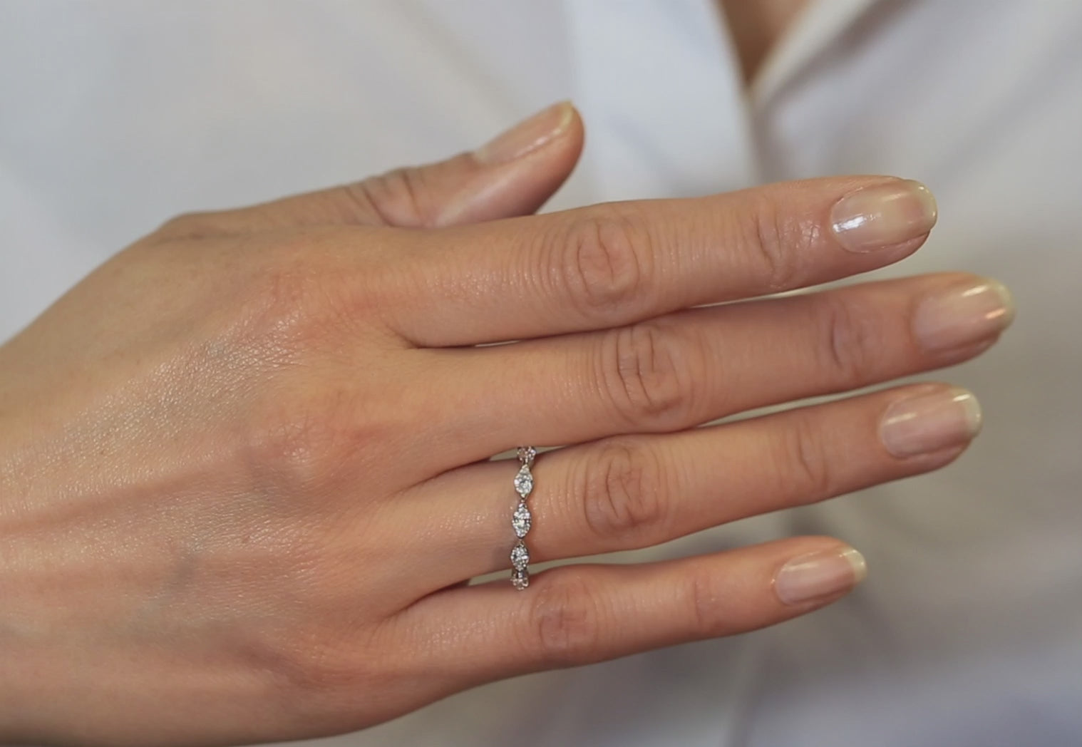Anillo de eternidad de platino con nueve diamantes en forma de marquesa de color G/H y claridad VS. Los diamantes están engastados en un marco de bisel de platino moderno, con los diamantes en dirección este-oeste.