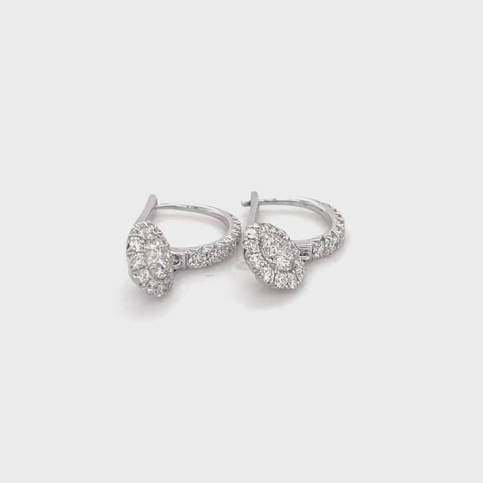 These sleek and stylish halo solitaire diamond huggie earrings sit comfortably and securely on the ear. Beautiful from every angle, the unique 14K white gold clasp with 0.59 carats in diamonds makes a statement no matter how you wear it.