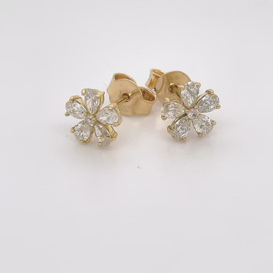 Five pear-shaped diamonds connect with a center round brilliant diamond. Set in 18K yellow gold these diamond earrings fit comfortably on the ear and can be worn every day and will never get old. Do you feel lucky?