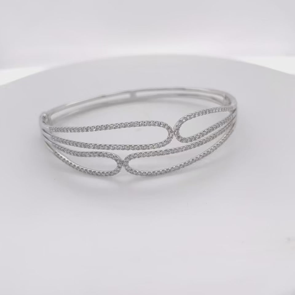 Dripping with 1.56 carats in diamondlike waves, these waves meet each other at different focal points on this stunning bangle. Contemporary enough to be a versatile everyday piece, this bangle also adds an extra splash of sparkle to your favorite evening ensemble.