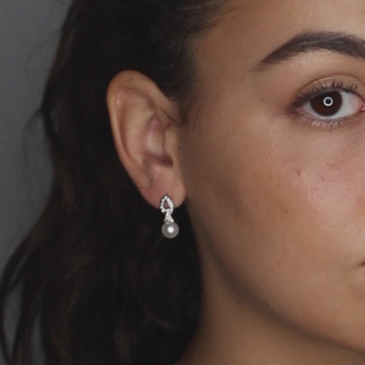 An antique 14K white gold setting with a contemporary design make these elegant pearl and diamond drop earrings a must-have. With 7mm freshwater cultured pearls and 0.16 carats in diamonds, glitter and shine day or night.