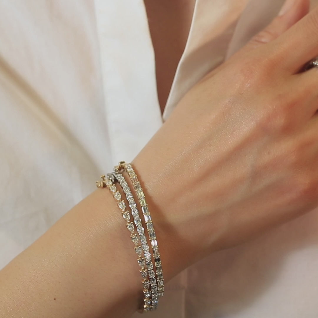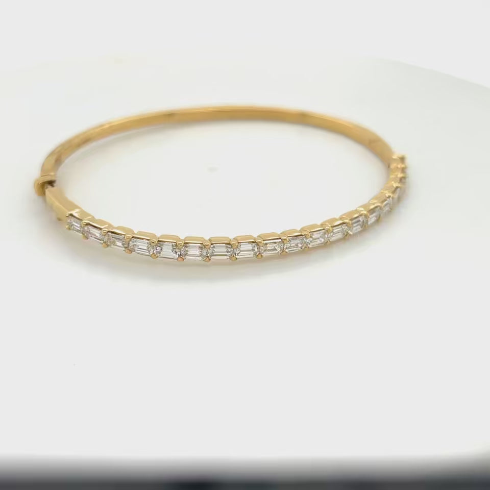 Beautifully matched emerald cut diamonds set in this 18K yellow bangle. The diamonds are set east-west to give it a clean line. Stack this with all your other bracelets.