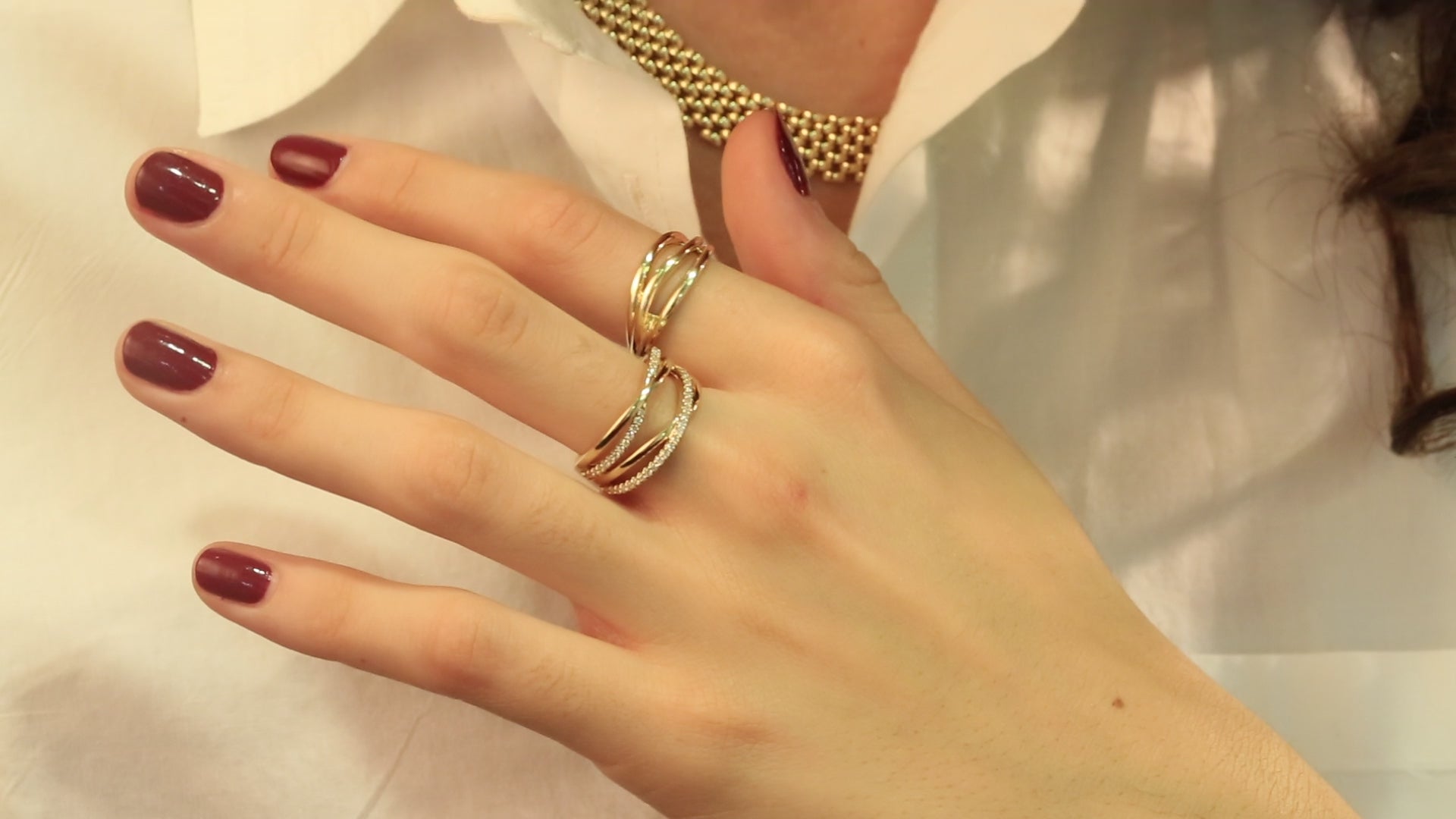 The criss-cross design of solid 14K yellow gold and diamonds meshes perfectly. Comfortable and stylish.