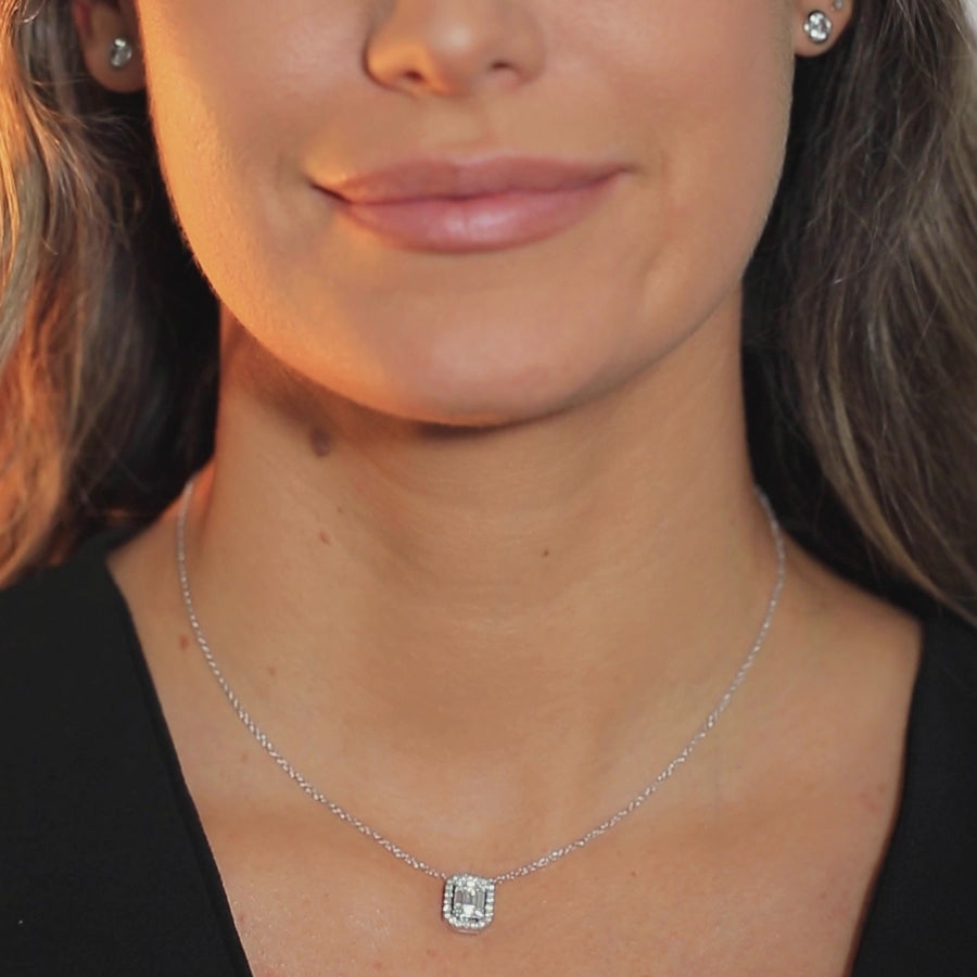 Make a sparkling statement in our Italian-made Square Halo Diamond Pendant, with 31 diamonds G-H color and VS2 clarity totaling 0.76 carats 4.87 grams of 18K white gold with an 18" chain.