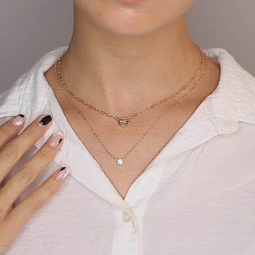 This stylish solid gold and diamond toggled necklace is perfect for everyday wear. Rose and yellow gold options are both made-to-order and cannot be returned.
