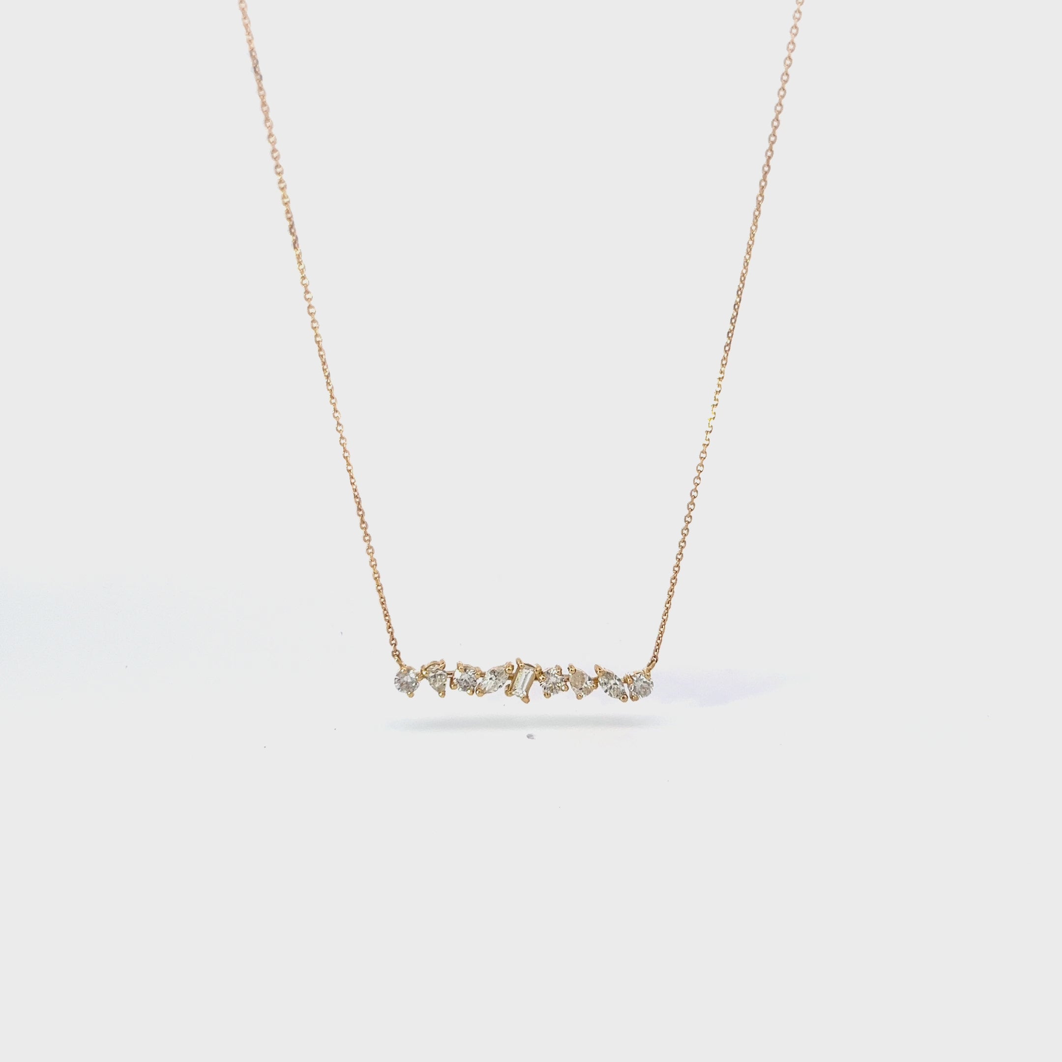This necklace features an eclectic array of diamond shapes set artistically in either 18K white or yellow gold design to add subtle sparkle and glamour to any outfit. With (9) diamonds totaling 0.80 TCW of I1 clarity and H/I color, you'll be living up to the motto that variety is the spice of life!